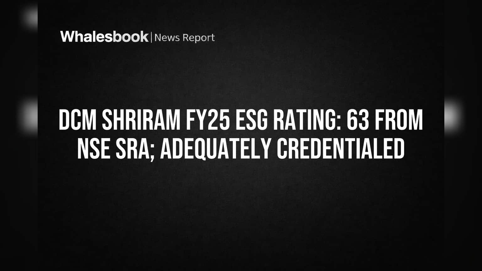 DCM Shriram's ESG Rating for FY25 was 63. NSE SRA is a Category 1 ESG Rating Provider registered with SEBI.