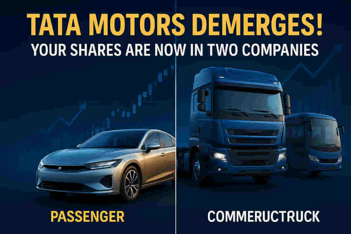 Tata Motors is splitting into two separately listed companies: one for Commercial Vehicles (CV) and one for Passenger Vehicles (PV), including EVs and Jaguar Land Rover. Shareholders get one share of the new CV entity for every share they hold in Tata Motors. The CV shares were credited to demat accounts on October 16, 2025, and are expected to start trading by late November or early December 2025 after exchange approvals.