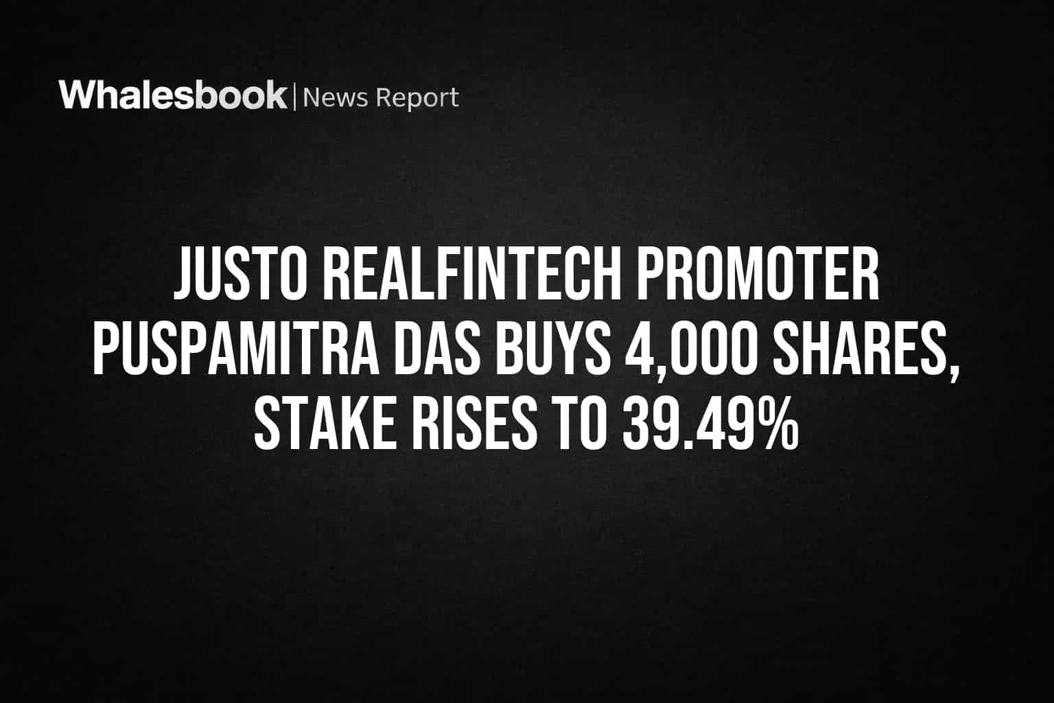 Promoter Puspamitra Das has acquired an additional 4,000 shares of Justo Realfintech Limited through open market transactions on March 10, 2026. This latest purchase incrementally raises his total shareholding to 39.49% from the previous 39.47%.