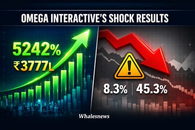 Omega Interactive Technologies Ltd. announced staggering Q3 FY26 financial results, showcasing a colossal revenue increase of 5242.5% year-on-year (YoY), reaching ₹3,777.74 Lakhs from ₹70.64 Lakhs in Q3 FY25. Quarter-on-quarter, revenue grew 94.28% from ₹1,944.50 Lakhs in Q2 FY26. Net Profit for the quarter jumped 880.4% YoY to ₹314.12 Lakhs, up from ₹32.04 Lakhs in Q3 FY25. QoQ, Net Profit increased 67.40% from ₹187.66 Lakhs. Basic Earnings Per Share (EPS) was ₹12.12, a 490.09% YoY increase from ₹2.02 in Q3 FY25, and up 67.40% from ₹7.24 in Q2 FY26.